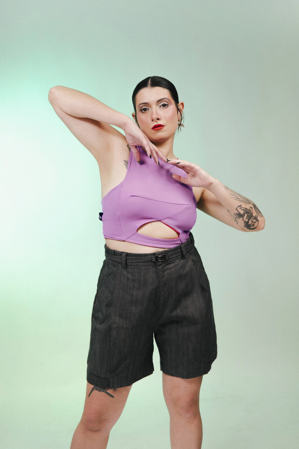 Algumas sugestões de combinação, que vão bem no jogo de esconde e mostra, são as peças de cintura alta como a Calça Dobradubra e a Calça Shingo. Também vale apostar em combinar diferentes cavas, por exemplo ~ experimenta com o Macacão Shingo que dá boa. E apesar de ser um modelo cropped e decotado nas costas, na frente ele é mais fechado pra criar looks com sobreposições de blazer ou jaqueta que não mostrem tanto a pele.